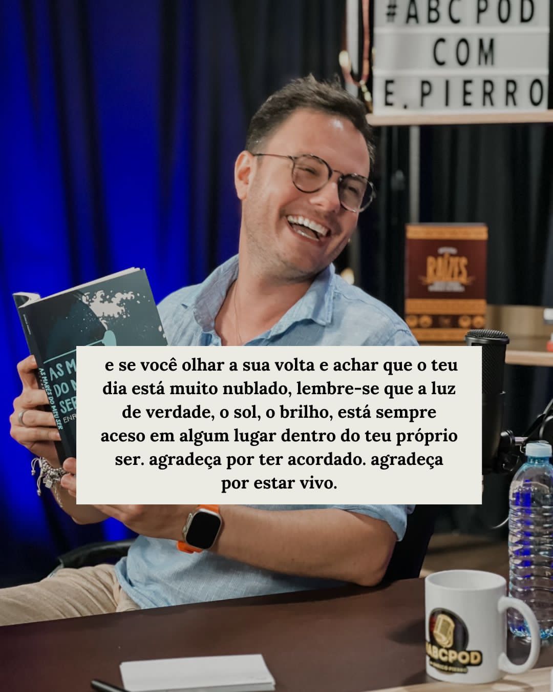 e se você olhar a sua volta e achar que o teu dia está muito nublado, lembre-se que a luz de verdade, o sol, o brilho, está sempre aceso em algum lugar dentro do teu próprio ser. agradeça por ter acordado. agradeça por estar vivo. agradeça por ter lido esse texto. agradeça porque amanhã é e sempre será um novo dia. ah, e eu já ia me esquecendo, se você chegou até aqui, obrigado por ter lido. eu sou o enrico pierro e te vejo aqui na próxima semana.